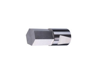 Ротационная шестигранная прошивка РП08-0502.5 S200 с задним углом 1-1.5° из быстрорежущей стали и твердостью 60 HRC предназначена для изготовления шестигранных отверстий шириной 2.5 мм., на глубину до 5 мм., в различных материалах, включая стали углеродистые и легированные, нержавеющие стали на универсальных токарных станках в том числе с ЧПУ. Предварительное сверление сверлом 2.6 мм., на глубину от 5.5 мм. Скорость подачи: 0.02–0.06 мм/оборот (стальные детали). Скорость вращения патрона: 600–2000 об/мин. (стальные детали).